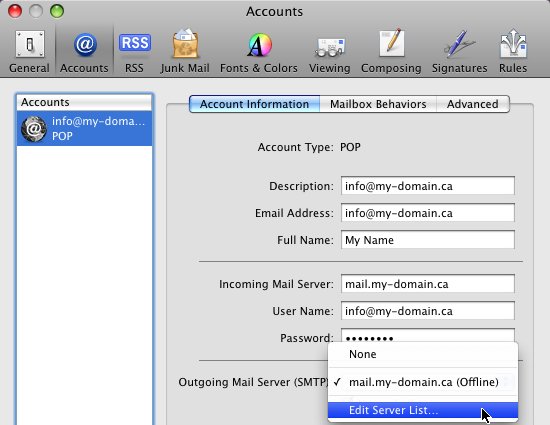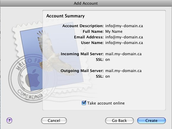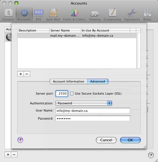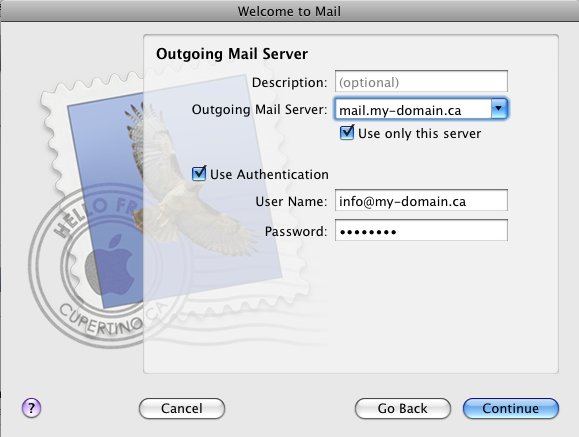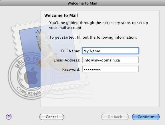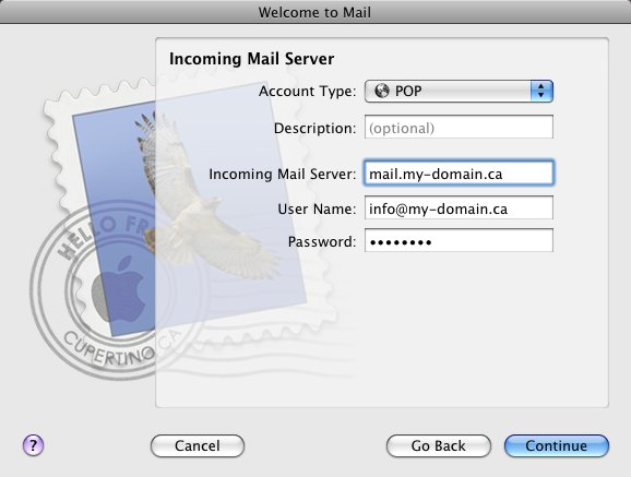 mail.my-domain.ca (substitute your domain name). Your User Name and Password should be your full email address and password, as on the first screen. Click Continue. (It may take a while when "Checking connection to mail server". This is annoying, but normal).